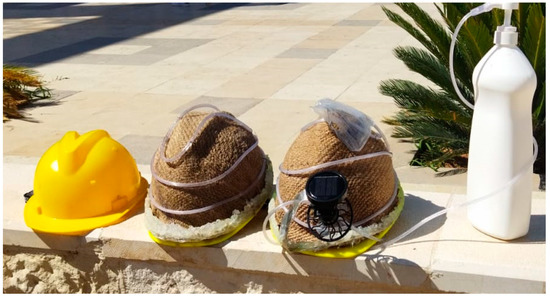 - A water supply bottle which holds water used to moisten the helmet cover and is equipped with a hand pump that allows pushing the water towards the reservoir at the top of the helmet.