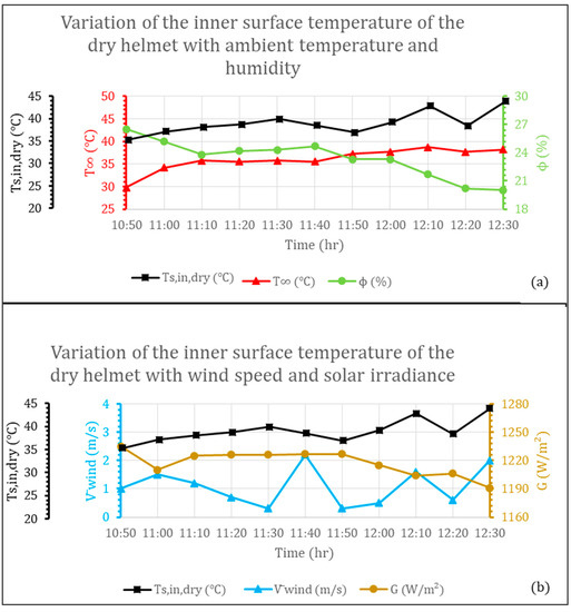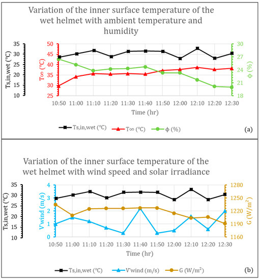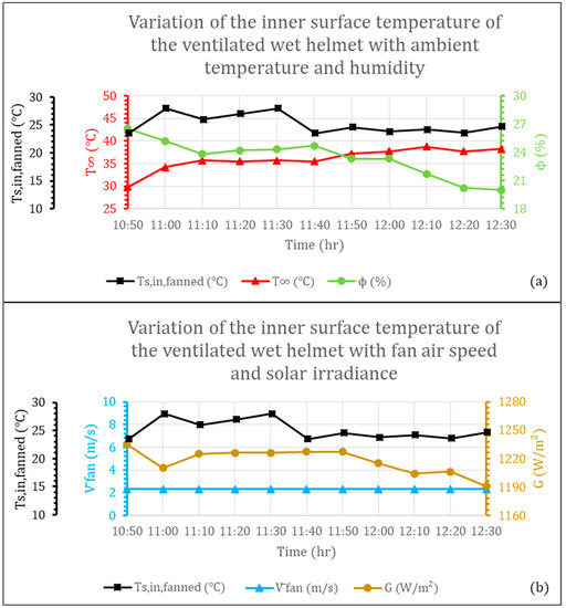 The variations of the inner surface temperature with the various parameters, ambient temperature, wind speed, relative humidity, and solar intensity are shown in Figure 3, Figure 4 and Figure 5. In the case of the dry helmet system, shown in Figure 3, the inner temperature ranges between 35.3 and 43.9 with an average of 39 °C. In the case of the wet helmet system, shown in Figure 4, the inner temperature ranges between 27.9 and 32.8 with an average of 30.3 °C. This means that there was a drop of about 9 degrees in the temperature due to the addition of the wet cover. Considering the case in which the solar fan is added, shown in Figure 5, it can be noticed that the temperature of the inner surface ranges between 23.5 and 28 with an average that dropped to reach 25.2 °C. This means a drop of about 14 degrees with respect to the dry helmet case. This is an important result because this range of temperatures is compatible with the range that suits human comfort.