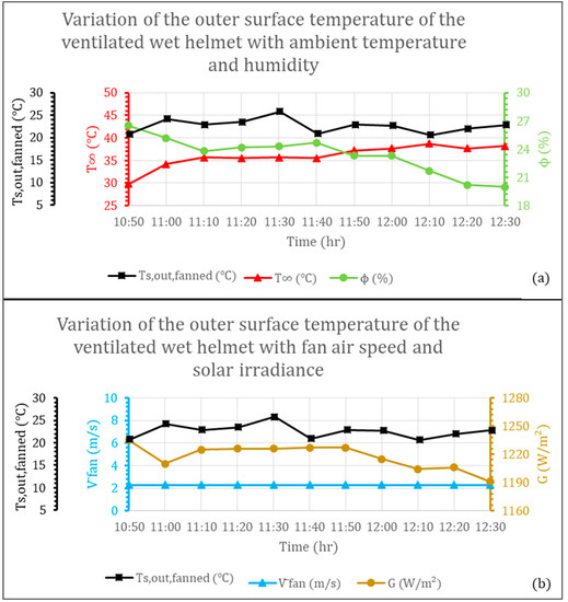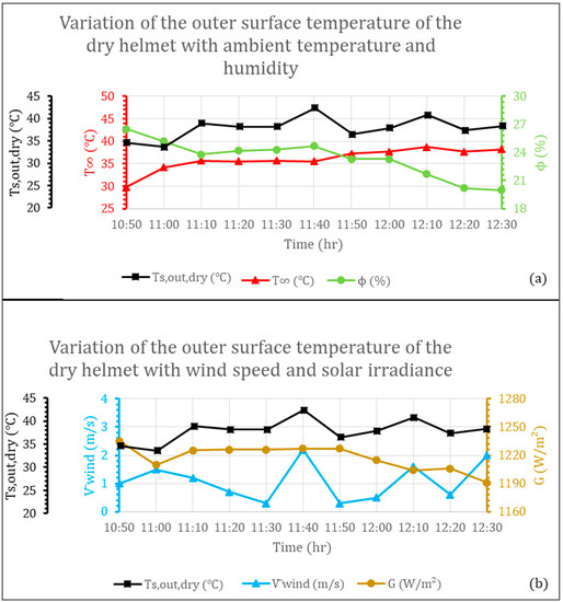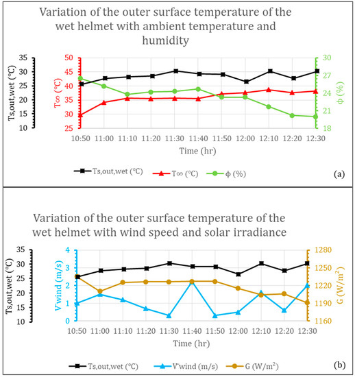 The variations of the outer surface temperature with the various parameters, ambient temperature, wind speed, relative humidity, and solar intensity are shown in Figure 6, Figure 7 and Figure 8. It can be noticed that the average temperatures of the outer surface were 37.9, 28.5, and 22.7 °C in the cases of the dry helmet, wet helmet, and ventilated wet helmet, respectively. That is, the wet cover led to a decrease of about 9 degrees, and the use of the fan led to an additional decrease of about 6 degrees. Additionally, in this case, the stability of the outer surface temperature is noticed in both cases, the wet helmet and the ventilated wet helmet.