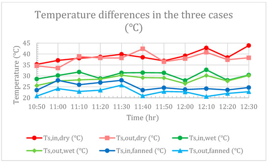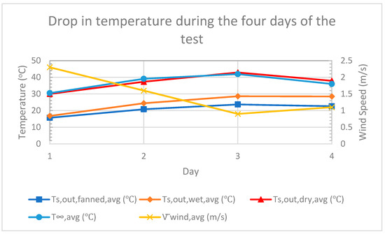 To compare the results during the four test days, the drop in temperatures in the cases of the wet cover and the ventilated wet cover is shown in Figure 10. This drop in the case of the ventilated wet cover compared with the dry cover during the four days was equivalent to 14.3, 16.5, 19.2, and 15.3 degrees, respectively. The significant drop on the third day can be attributed to the significant rise in the ambient temperature on that day as it reached 41.9 °C, which contributed to a significant increase in the evaporation rate. It is also noticed that the drop in temperature on the first day in the case of the ventilated wet helmet is very close to that in the case of the wet helmet without the fan. This can be explained if it is noticed that the average wind speed without the fan was very close to the wind speed caused by the presence of the fan, which is equivalent to 3.2 m/s.
