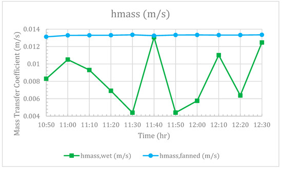 The effect of the fan presence on the mass transfer coefficient is shown in Figure 11. It can be noticed that there is a significant increase due to the presence of the fan. The average value without the presence of the fan is 0.0084, and that with the presence of the fan is 0.0133 m/s with an improvement of 58.1%. It can also be seen that there is stability in the values of the coefficient in the case of the fan presence while taking higher values, whereas there is a fluctuation in the values in the case of the wet helmet without the fan. The reason for this result is that the ventilated helmet was exposed to a constant-velocity wind generated by the fan with values greater than the variable wind velocity experienced by the wet helmet. Looking at the figure, it is noticed that the coefficient values in the two cases are very close to each other at 11:40 pm. Looking at the speed values, it can be noticed that there is a great convergence between the air speed without a fan, which is equal to 2.2 m/s, and that with the fan, which is equal to 2.3 m/s. This shows that wind speed is the main factor affecting the mass transfer coefficient.