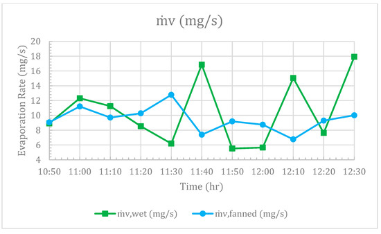 This effect reflects positively on the evaporation rate from the wet cover and the ventilated wet cover as shown in Figure 12. This effect is represented in the relative stability of the evaporation rate in the case of the presence of the fan as a result of the stability of the wind speed generated by it. It can be noticed that the average values in the two cases are almost identical, 0.01 g/s in the case of the wet helmet and 0.0095 g/s in the case of the ventilated wet helmet. The fact that the evaporation rate is lower than expected in the presence of the fan can be explained by the fact that the temperature of the wet surface in this case is lower than in the absence of a fan, which contributes to reducing the evaporation rate. The average value of the evaporation rate can be used for sizing the supply bottle by multiplying the average evaporation rate by the required operating period.