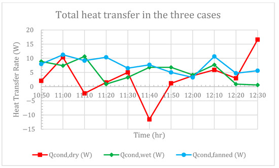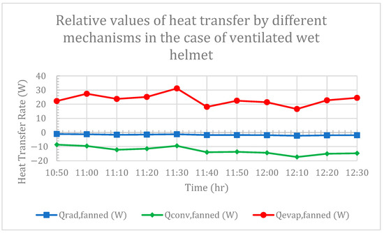 The total heat transfer in the three cases considered can be evaluated by evaluating the heat transfer by conduction through the helmet shell. The reason for this is that the heat flow itself turns into other mechanisms such as convection, radiation, and evaporation after leaving the outer surface. The conduction heat transfer in the three cases can be evaluated based on the temperatures of the inner and outer surfaces recorded experimentally. As expected, the ventilated wet helmet has the highest value with an average value of 7.485 W, followed by the wet helmet with an average value of 5.277 W, followed by the dry helmet with an average value of 3.231 W. This means that there was an increase in the cooling rate equivalent to 63.3% when adding the wet cover, to increase to 131.7% when adding the fan with the wet cover. In addition to the advantage of increasing the cooling rate, there was another advantage that appears in Figure 13, which is the increase in the stability of the flow rate with the addition of the wet cover and the achievement of more stability with the addition of the fan.