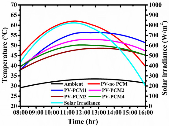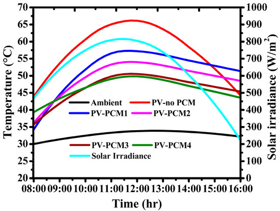 Cooling the PV module over the raise in the PV module operating temperature will improve the voltage and current production. It is noted that during the summer, the PV module temperature rises abruptly; however, under tropical locations, a non-summer period also requires the cooling system to obtain a higher efficiency and performance ratio. During March, the experimental location’s ambient temperature started raising higher than 30 °C at the experimentation starting period and reached the peak ambient temperature of 33.91 °C. The rise in ambient temperature is highly correlated with the rise in PV module temperature as compared to solar irradiance and other environmental factors [18]. Figure 2 shows the overall performance of the PV module operations using four different PCM melting temperatures. Owing to the effective solar irradiance, the ambient temperature rose higher than in winter, resulting in the PV module operating temperature reaching a peak of 66.17 °C. At the starting period of experimentation, the PV-noPCM operating temperature was sustained at 45 °C and the corresponding PCM1-, PCM2-, PCM3-, and PCM4-assisted PV module operating temperatures were maintained at 34.1 °C, 35.8 °C, 36.4 °C, and 39.1 °C, respectively. Notably, PCM1 maintained a lower operating temperature than other PCMs and PCM4 maintained a higher operating temperature; however, it is lower than PV-noPCM. Considering the low melting temperature of PCM1, the early period of the experiment enhanced effective cooling and PV-PCM4 exhibits lower cooling due to the high melting temperature. A further increase in solar irradiance delivers higher PV module operating temperatures; during 09:30, PV-noPCM temperature reached 57.46 °C and, notably, PV-PCM1, PV-PCM2, PV-PCM3, and PV-PCM4 operating temperatures reached 48.52 °C, 47.02 °C, 44.34 °C, and 45.01 °C, respectively. The PV-PCM1 cooling effect started declining due to the liquefaction of PCM at an early stage of experimentation. It is found that lower PCM melting temperatures are not suitable for non-winter conditions. Further, throughout the experimentation period, PCM1-assisted PV module operating temperature is higher than other PCMs and, beneficially, it is noted that PCM4 maintained a maximum of 16.34 °C lower than PV-noPCM which is the highest cooling rate as compared to other PCMs. However, a similar operation was achieved for PCM3 following PCM4. It is concluded that for pre-summer climatic conditions, PCM4 and PCM3 are suitable for cooling the excess rise in the PV module temperature.
