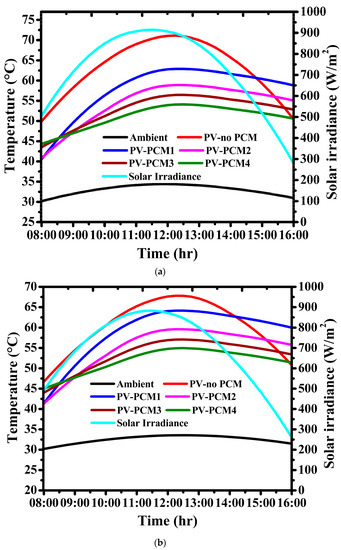 Solar irradiance and thermal profile of PV with and without PCM for (a) June and (b) July.