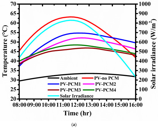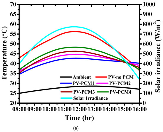 Figure 3 shows the meteorological and PV module thermal profiles under summer climatic conditions. For the experimental location, April and May are considered summer periods owing to the higher ambient temperature of 34.39 °C and 33.57 °C, as shown in Figure 3a,b, respectively. April average solar irradiance shows that the experimental location is rich in solar energy with a peak of 910 W/m2 resulting in higher PV module operating temperature attained due to high ambient temperature. Following pre-summer, the performance of the PCMs integration with PV module shows a similar trend owing to the high solar irradiance. Such as in the early period of the experimentation, PCM1 cooled the PV module in higher order, the further rising solar irradiance directly increased the PV module operating temperature, and the cooling effect decreased for PCM1-integrated PV module due to low melting temperature. At 09:00, PCM4 started cooling the PV module temperature higher than other PCMs, and following that, throughout the experimentation period, PCM4 enhanced the cooling effect in higher-order; however, PCM3 exhibits a similar performance to PCM4. During the effective sunshine hours, PV-noPCM, PV-PCM1, PV-PCM2, PV-PCM3 and PV-PCM4 maintained the operating temperature of 71.12 °C, 62.89 °C, 58.90 °C, 56.47 °C and 54.11 °C, respectively. Notably, the period during May shows a peak irradiance of 882.95 W/m2, and the corresponding PV module performances are similar to that of April. PCM delivers the cooling effect throughout the experimentation period with a peak cooling of 4.3 °C, 8.84 °C, 11.36 °C, and 13.48 °C for PV-PCM1, PV-PCM2, PV-PCM3, and PV-PCM4, respectively.