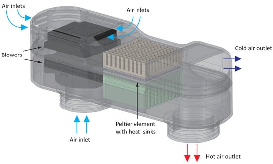 Experimental studies, system modeling studies, and numerical analysis studies have been conducted complementarily to design and evaluate the performance of portable Peltier coolers. Experimental studies aim to measure cooler prototypes’ performance, identify technical issues, and draw design improvement plans where necessary. The testing apparatus for Peltier coolers has been designed and constructed to measure air flow rate and temperature, surface temperature distribution, fan rotation speed, and power consumption by using various sensors and data acquisition devices such as anemometers, thermocouples, thermographic cameras, electrical power sensors, motor encoders, and so forth [9,10,11,12]. For example, experimental studies have been conducted to determine the performance characteristics of the cooler by measuring the coefficient of performance (COP), a widely used figure of merit for thermoelectric cooling systems, against the blower fan speed or by measuring the electric consumption versus COP relation [11,12].