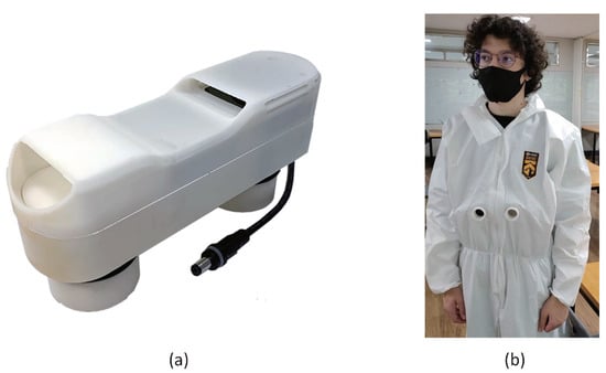 Internal heat sources can be technically removed in a way that the electric motors located outside the air ducts transmit the rotational power inward through the shafts. Cyro™, the Peltier cooling device for protective clothing shown in Figure 2a, satisfies three of the four technical requirements specified in Section 2, i.e., operating time, size, and weight, except for temperature reduction by 5 °C. The next version of Cryo™, with improved cooling performance through design optimization and heat removal inside the air duct, is currently under development through industry–academia cooperation.
