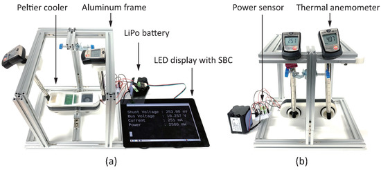 An experimental study was conducted to evaluate the performance of the Peltier cooler prototype and obtain experimental data to validate the simulation results. Figure 3 shows the experimental apparatus for testing the cooler’s performance. Figure 3a,b present an experimental setup for the cold and the other side duct, respectively. The apparatus comprises a structural frame, various sensors, and a data collection board with a flat-panel display. The main frame for fixing the cooling device and the sensing components is the assembled structure of aluminum extrusion profiles. A pair of thermal anemometers measured the velocity and temperature of the air in both the inlet and outlet. Although not shown in Figure 3, the non-contact thermal camera module (Letpton 3.5 manufactured by Teledyne FLIR LLC, Wilsonville, OR, USA) and a portable thermal camera (GTC-600C supplied by Robert Bosch GmbH, Gerlingen, Germany) monitored the surface temperature of the subject device. The opaque plastic cover was partially cut and replaced with a transparent film, as shown in Figure 3a, to capture the surface temperature of the heat sink and the blower inside the cold air duct with thermal cameras. Power digital wattmeters (Model SEN0291 by Zhiwei Robotics Corp., Shanghai, China) were used to measure power consumption by sensing the shunt voltage and the electric current for electric components such as the thermoelectric element and the blower motors. A single-board computer (Raspberry Pi 4 Model B made by Raspberry Pi Foundation, Cambridge, UK) processed the wattmeter data to be displayed on the monitoring panel.