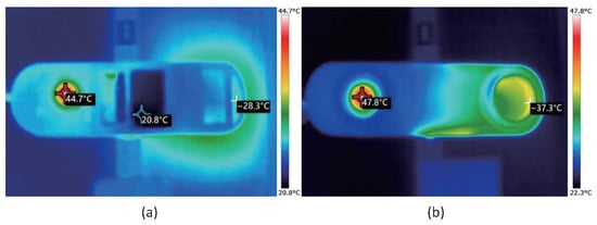 Figure 4 shows the temperature distribution plots for the portable Peltier cooler in operation obtained by the infrared thermal imaging camera. The minimum temperature on the upper surface of the heat sink in the cold air duct was measured as 20.8 °C. Meanwhile, the maximum temperature on the blower surface was 44.7 °C and 47.8 °C in the cold and hot air ducts, respectively. These measured surface temperatures were used as the essential boundary conditions imposed on the blower surfaces for heat transfer analysis.