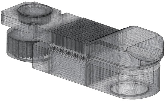 As the first step in the pre-processing, simulation domains subject to electro-thermo-fluidic analysis were selectively extracted from the CAD model illustrated in Figure 1. Among shape details, small-sized features were eliminated, such as small rounds or steps, since they may cause poor computational efficiency due to unnecessary element refinement without significantly affecting computational accuracy. Subsequently, the connectivity between CAD components was checked and modified where necessary to extract the three-dimensional volumes corresponding to the fluid domains so that each cavity space had a well-defined continuous and closed surface. In total, two fluid domains corresponding to cold and hot air ducts were created from the cavity of the CAD assembly model after small feature removal and continuity check. After the fluid volume creation, solid parts, such as the plastic covers and fan blades, not included in the computational analysis were removed. Thin adhesive layers between the thermoelectric part and the heat sinks were modeled as shell elements, not three-dimensional elements. The thickness was set to 500 m to calculate the adhesive layer’s thermal resistance and temperature gradient using the shell element.