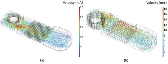 Figure 6 shows the fluid velocity fields visualized as vector arrows in the cold and hot air ducts. The cold duct has a maximum speed of 27.32 m/s in the entire domain and an average normal velocity of 6.28 m/s through the middle cross-section of the heat sink. Meanwhile, the highest fluid speed in the hot air duct and the average cross-sectional velocity in the heat sink was calculated as 19.63 m/s and 7.60 m/s, respectively.