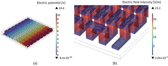 Simulation results: (a) electric potential distribution and (b) electric field intensity distribution with current density vectors.
