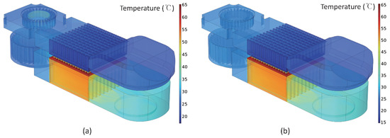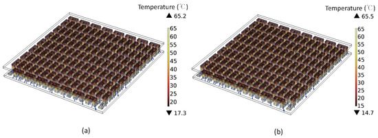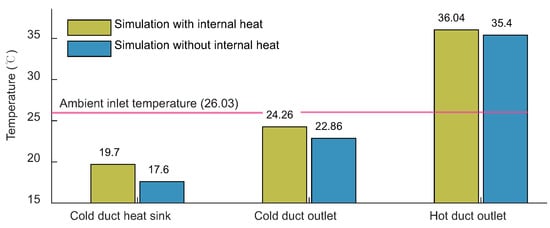 Figure 10 depicts a bar chart comparing the average temperatures computed at three locations of interest from the temperature fields numerically obtained for the two simulation cases shown in Figure 8. The minimum heat sink surface temperature, the cold duct mean outlet temperature, and the hot duct average outlet temperature were 19.7 °C, 24.26 °C, and 30.04 °C, respectively, in the simulation accounting for the blower heat generation. In the other simulation with no account for the heat generation effect, meanwhile, the minimum heat sink surface temperature, the cold duct mean outlet temperature, and the hot duct average outlet temperature were 17.6 °C, 22.86 °C, and 35.4 °C, respectively, which were all lower than the simulation results considering blower heat.
