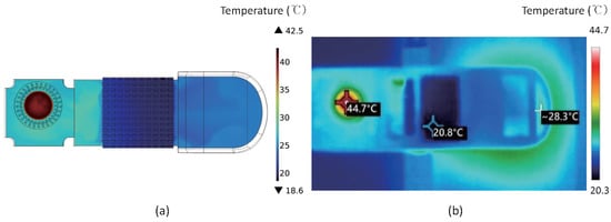 Figure 11 depicts the color-contoured temperature distribution only in the electric domain and the thermal energy transfer represented by vector arrows at 5000 different Gauss quadrature points. The length of each arrow was set in proportion to the vector magnitude of the heat transfer. The simulation results illustrate that the Peltier effect pumps the thermal energy from the top low-temperature region to the bottom high-temperature region so that the air can refrigerate in the upper chamber. In addition, this numerical analysis confirmed that the Peltier effect becomes more active due to the removal of the motor heat, which leads to further lower temperatures in the low-temperature side of the thermoelectric cooling module.