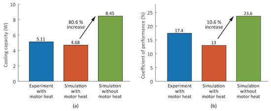 Figure 12 comparatively shows the cooling capacity and COP derived from the performance test and two simulation cases as a bar chart. Even considering that the simulation results slightly underestimate the experimental results, it can be concluded from these thermo-electro-fluidic simulations that removing the internal heat source can significantly improve the cooling capacity by 80.6% from 4.68 W to 8.45 W, and accordingly, the COP by 10.6% from 13.0% to 23.6%.