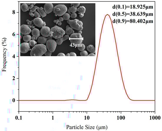 The aluminum particles were obtained from Shanghai Shuitian Materials Technology Co., Ltd. (Shanghai, China), with a nominal particle size of 50 μm, and the particle size d50 obtained by laser particle size analysis was 38.639 μm, as shown in Figure 1.