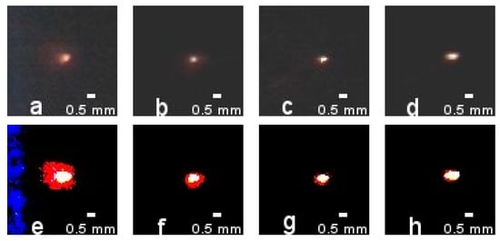 Burning particles and their gas-phase flames under different Xeff at 2000 K: (a–d): particles combustion at 13%, 17%, 21%, and 25% of Xeff; (e–h): particle combustion after image enhancement.