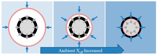 The transformation process of combustion process when Xeff increased. The black layer, pink layer, blue arrow, and gray arrow indicate the surface oxide film, the Al-O reaction surface, the oxidant diffusion, and the Al (g) diffusion, respectively.