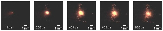 When Huang [30] et al. studied laser-induced ignition combustion of Al/Mg alloy powders, they found that the combustion process involved decomposition of the intermetallic compound phase, overflow of the metal boiling gas phase inside the particle, and multiple microexplosion processes of the same particle with microexplosion time intervals of about 300–600 μs.