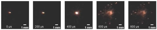 Continuous images of the microexplosion process of aluminum particles with a particle size of 50 μm at Xeff of 17%, 2000 K, Δt = 200 μs.