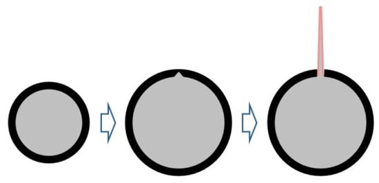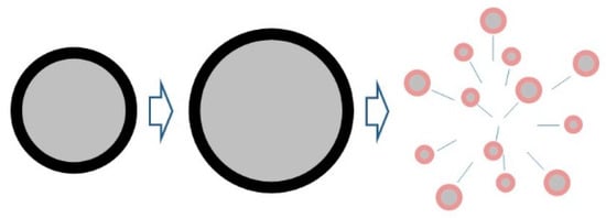 Diagram of the particle microexplosion process. The black layer indicates the surface oxide film, the gray layer indicates the internal aluminum, and the red layer indicates the oxidation reaction surface.