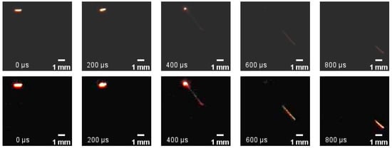 The phenomenon photographed here is an ejection of tissue within the particle, rather than a mere particle motion resulting in a trailing shadow, since the ejection beam speed was calibrated to reach an average of 20 m/s and a maximum of over 40 m/s, while the average motion speed of aluminum particles in the current environment is only 1–2 m/s. The speed of the ejection beam is an order of magnitude greater than the original speed of particle motion, which rules out the possibility that the ejection beam image is simply a trailing shadow of the particle’s own motion. The possibility of a trailing shadow of the particles themselves can be ruled out. The velocity of the ejected beam is suddenly accelerated from a low velocity to a high velocity, and then decelerated back to a low velocity due to the sudden acceleration caused by the ejection of the internal components of the particles, after which the velocity of the ejected material is much greater than the velocity of the air stream and is subject to the drag of the air stream in the opposite direction to that of the motion, resulting in a deceleration to the pre-ejection velocity level.