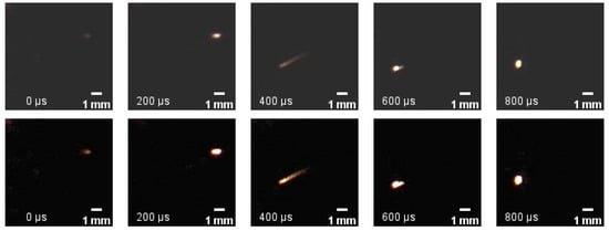 Ejection combustion process at Xeff of 21% and 2200 K with a shot interval of Δt = 200 μs. Downstream is image after enhancement of upstream image.