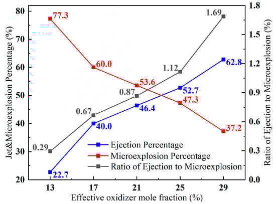 At the effective oxidizer mole fraction of 13%, according to the microexplosion mechanism for the combustion of aluminum particles accounting for 77.3% of all special combustion of aluminum particles, while the ejection and the phenomenon accounted for 22.7% of the total, the ratio of the number of the two is 0.29, indicating that the microexplosion is the main special combustion phenomenon under the oxidation concentration. With the increase of oxidation concentration of the combustion environment, in all aluminum particles of special combustion phenomena, the proportion of microexplosion decreased, and the proportion of ejections increased. Oxidation concentration increases to 25%, microexplosions accounted for 47.3%, while the proportion of ejections accounted for 52.7%, more than microexplosions, so the ejections become the main special combustion phenomenon under high oxidation concentration. When the effective oxidizer mole fraction of the environment reaches 29%, the ejection phenomenon accounts for 62.8%, and the ratio of the number of ejections to microexplosions reaches 1.69.