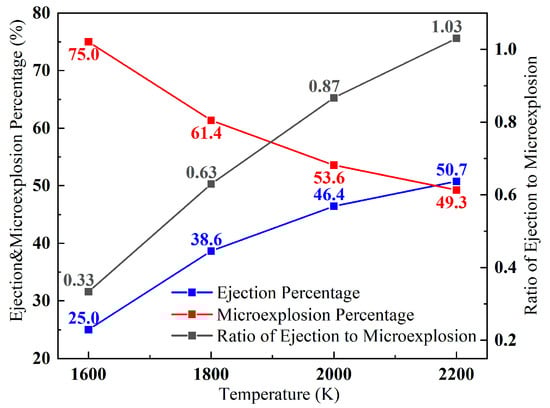 At an ambient temperature of 1600 K, microexplosion aluminum particles accounted for 75% of all special combustion aluminum particles for the current combustion temperature of the dominant combustion phenomenon with the ambient temperature increases, the proportion of ejections increases, and the proportion of microexplosion decreases. When the ambient temperature reaches 2200 K, the proportion of ejection phenomenon reaches 50.7%, and the ratio of the number of ejections to microexplosion reaches 1.03. The change in the pattern of ejections and microexplosion as the ambient temperature increases is the same as in the conjecture, which confirms that the particle heating rate leads to a shift from microexplosion to ejections.