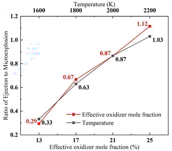 In addition, comparing the special combustion ejection/microexplosion ratios at equivalent oxidation concentrations from 13% to 17% and ambient temperatures from 1600 K to 2200 K shows a high correlation between the two (Figure 12). Statistical analysis of the Pearson’s correlation coefficient between the two factors Pearson’s R reached 0.99582 with a p-value of 0.00418, indicating an extremely strong linear correlation between the two. Thus, for the ejection/microexplosion ratio indicator, increasing the temperature alone and increasing the ambient oxidant concentration alone have very similar effects in this range, with oxidant concentrations of 13% to 25% for each 4% increase in the ratio of the number of particle ejection/microexplosion combustion phenomena having essentially the same effect as the temperature from 1600 K to 2200 K for each 200 K increase, indicating that, in this interval, the temperature factor and the effect of the oxidation concentration factor on the ratio of the special combustion phenomena of the two particles are in accordance with a certain equivalence relationship, said equivalence relationship being T = 5000 Xeff + 950.