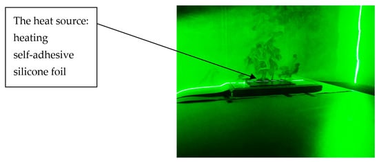 Figure 3 depicts the experimental setup, which includes a heating self-adhesive silicone foil (TF542) with specific dimensions (0.3 m × 0.2 m × 0.0013 m) and temperature capabilities—maximum temperature +200 °C. The foil generates a certain amount of power and affects the surrounding air flow through natural convection.