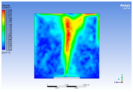 To observe the airflow surrounding a heating foil, an experimental PIV (Particle Image Velocimetry) method was implemented. The approach involved using a high-speed camera to capture images of the light scattered from tracer particles within the fluid stream. The resulting images were subsequently analyzed using computer software to generate velocity maps along the entirety of the heating foil, pinpointing areas of peak velocity and temperature values of the airflow. The average temperature of the airflow was 26.85 °C, while the heating foil had 124 °C and the average air velocity was approximately 0.2 m·s−1. These values were then used as inputs for a numerical simulation, which resulted in obtaining contours of temperature and airflow velocity for a 3D model of natural convection. Figure 6 shows the temperature contour, and Figure 7 shows the airflow velocity contour. The velocity contour demonstrates the creation of disturbing elements and air vortices due to the open space in the laboratory, which is expected in a real situation where there are other equipment influencing the heat transfer of the experiment. The details of these disturbing elements are shown in Figure 8.