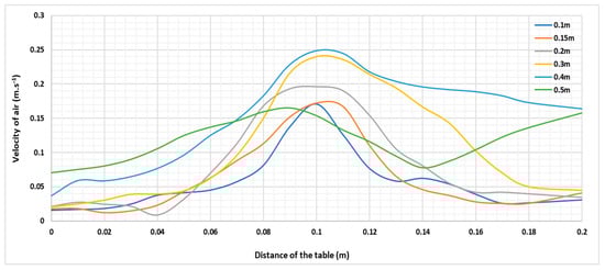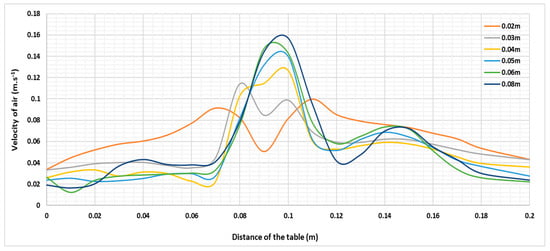 Straight lines were drawn on the images generated by the PIV method using an internal function, which allowed for the plotting of air velocities at predetermined heights above the surface of the heating foil. The straight lines were plotted at several distances above the surface of the heating foil in the range from 0.02 m to 0.4 m in different increments—0.02 m, 0.03 m, 0.04 m, 0.05 m, 0.06 m, 0.08 m, 0.1 m, 0.15 m, 0.2 m, 0.3 m, and 0.4 m.