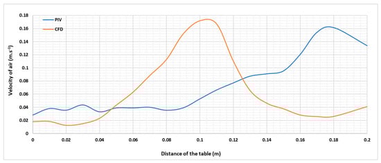 Figure 11 illustrates a comparison between the velocity curves derived from experimental measurements using PIV and the CFD simulation, taken at a height of 150 mm above the heating foil surface. It is apparent that the experimental speeds reach lower values than the simulation, likely due to various external influences that are difficult to account for in a numerical model. These external factors can cause random phenomena that occur in a real environment but are difficult to predict in a simulated one. The maximum air velocities at this height are 0.1720 m·s−1 in the CFD simulation, located in the middle of the plate, and 0.1614 m·s−1 in the PIV measurement, with the peak shifting more towards the wall due to interfering elements.
