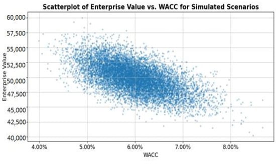 Scatterplot of enterprise value vs. WACC for simulated scenarios.