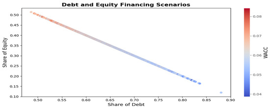 Figure 3, Figure 4 and Figure 5 illustrate the impact of varying the share of debt and share of equity on the company’s WACC, demonstrating the sensitivity of the optimal capital structure scenario to changes in these parameters. Moreover, they illustrate the inverse relationship between the company’s debt level and WACC.