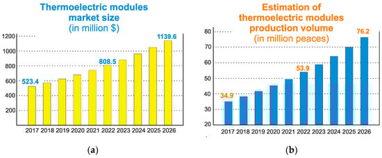 The practical application of thermoelectricity is currently constrained by the relatively high cost of thermoelectric energy convertors. Figure 1a shows a diagram [1,2] of the growth in the market size of thermoelectric (TE) modules produced worldwide for the needs of thermoelectric power generation and cooling. The data are provided for the last 6 years with a prospect up to 2026. The market compound annual growth rate (CAGR) is about 9% [1,2]. Using this diagram and assuming that the average price of a standard TE module is near USD 15, we can easily estimate the annual production of modules in the world. The results of such a rough estimation are shown in Figure 1b. It can be seen that, at present, the production reaches about 54 million pieces per year. At the same time, the market potential is estimated at 6.2 billion pieces per year [3]. Consequently, the market for thermoelectric products, which are mainly cooling systems and converters of the waste heat into electricity, is provided for by less than 1% now. Therefore, the market needs are quite significant.