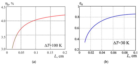 Dependences of maximum efficiency η0 (a) and maximum COP ε0 (b) on a thermoelement length L for the value of contact resistivity rc = 5 × 10−6 Ω cm2.