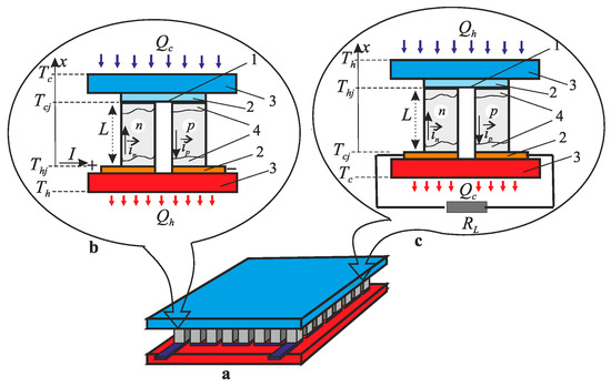 Schematic of TE module (a) and thermocouple converter in cooling mode (b) or power generation mode (c). 1—heat-absorbing thermocouple junction, 2—metallic interconnector, 3—insulating plate, 4—contact zone.