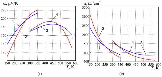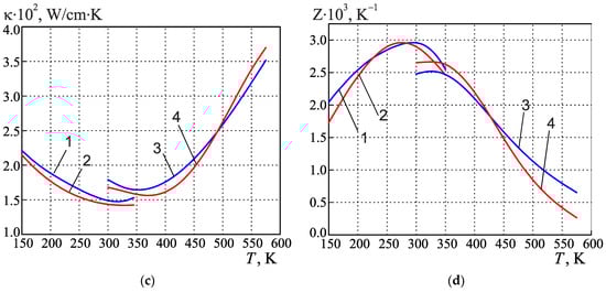 Temperature dependences of the Seebeck coefficient α (a), the electrical conductivity σ (b), the thermal conductivity κ (c) and the figure of merit Z (d) of materials for cooling modules: 1—n-type Bi2Te2.7Se0.3, 2—p-type Bi0.5Sb1.5Te3 and alloys used for generating converters: 3—n-type (Bi2Te3)0.90(Sb2Te3)0.05(Sb2Se3)0.05, 4—p-type (Bi2Te3)0.25(Sb2Te3)0.72(Sb2Se3)0.03.