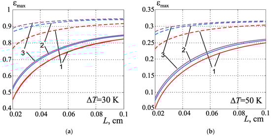 Dependences of the maximum COP εmax on the leg length L. Contact resistance: rc = 5 × 10−6 Ω cm2 (solid lines), rc = 10−7 Ω cm2 (dashed lines). Insulating plates: 1—Al2O3, 2—AlN and 3—pressed diamond powder. Temperature difference: ΔT = 30 K (a) and ΔT = 50 K (b). Th = 300 K.