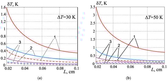 Dependences of temperature drop δT across the heat-releasing (solid lines) and heat-absorbing (dashed lines) insulating plates on the leg length L. rc = 5 × 10−6 Ω cm2. Insulating plates: 1—Al2O3, 2—AlN and 3—pressed diamond powder. ΔT = 30 K (a), ΔT = 50 K (b), Th = 300 K.