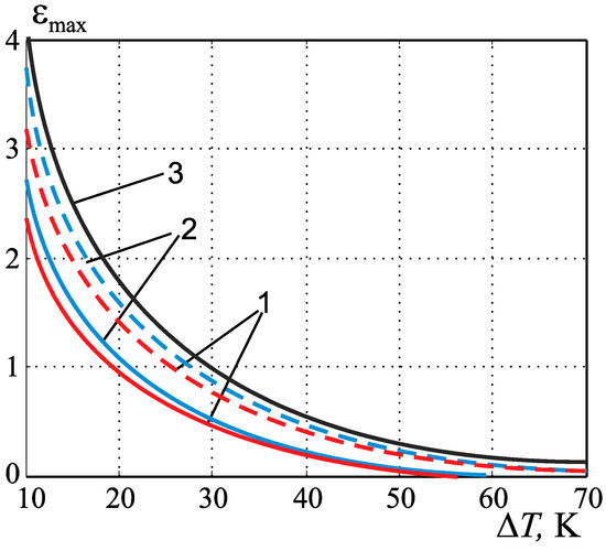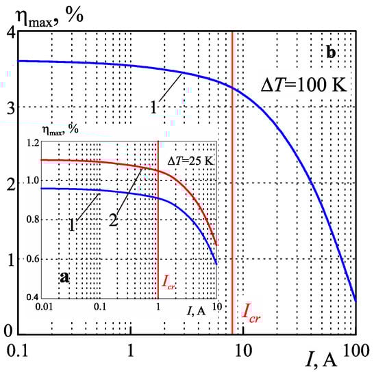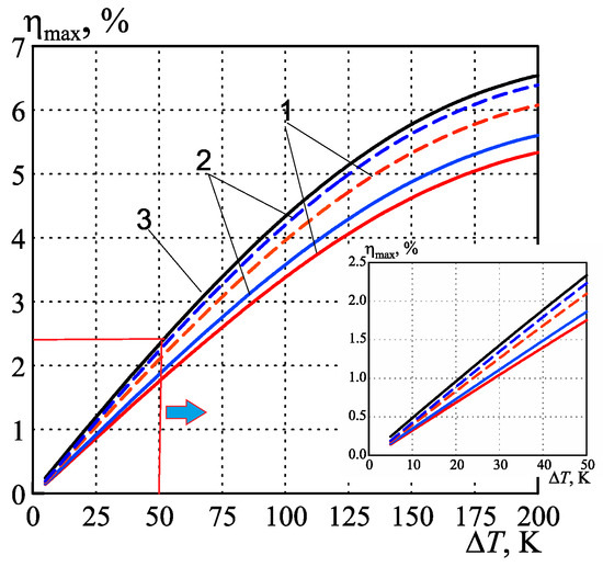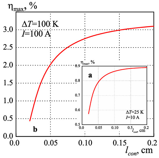 The dependences of the maximum COP εmax on a thermoelement length, calculated for temperature differences across the modules of 30 K and 50 K, are shown in Figure 5.