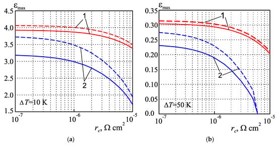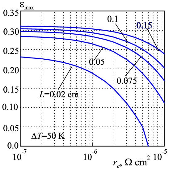 The effect of the thermal resistance of interconnectors and insulating plates results in the dependence of εmax on a thermoelement length for both the minimum (dashed lines in Figure 5) and the typical (solid lines in Figure 5) values of contact resistance. Reducing the leg length of module leads to a decrease in the COP, which is especially sharp if the length is less than 0.05 cm and the contact resistance is high.