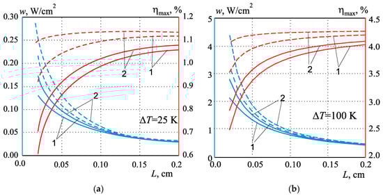 Figure 2 shows the dependences of efficiency (Figure 2a) and coefficient of performance (COP) (Figure 2b) on thermoelement length L for generating and cooling converters, respectively. The length L is indicated in Figure 3 below. These data have been calculated at a contact resistivity value of rc = 5 × 10−6 Ω cm2 [51], which is considered typical for mass-produced modules made of Bi2Te3-based materials.