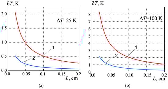 Obviously, δTh across the heat-releasing (solid lines in Figure 6) insulating plate is significantly greater than the drop δTc across the heat-absorbing one (dashed lines in Figure 6). The larger the temperature difference across the module and the thermal resistance of the insulating plates, the greater δT. For example, for modules with a leg length of 0.02 cm and insulating plates made of Al2O3, δTh reaches a value of 3.5 K (Figure 6b) for a temperature difference across the module of ΔT = 50 K. Accordingly, the temperature of heat-releasing junctions of thermocouples increases by the same value, thus causing a reduction of the COP.