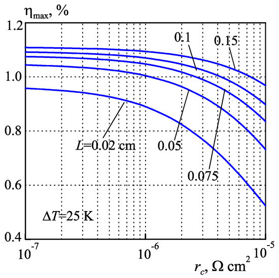 Dependences of maximum efficiency ηmax on the contact resistivity rc for different leg length L. ΔT = 25 K, insulating plates made of Al2O3.