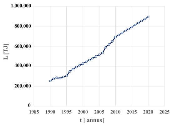 The rapid progress of motorization over the last three decades can be measured by the number of vehicles and the intensity of their use. However, this method is not an objective enough way for related calculations, as many cars are not used on a regular basis by their owners. Instead, a good measure of vehicle use intensity is fuel consumption. Figure 1 shows the national energy consumption-L by road vehicles in Poland between 1990 and 2020.