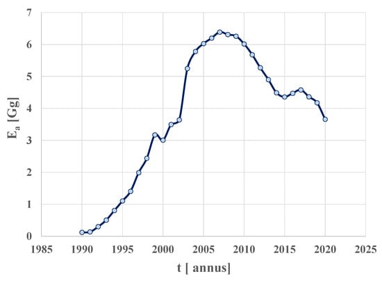 In most cases, irrespective of the dynamic development of motorization in Poland (dynamic increase in energy consumption at a country level—Figure 1), there was a clear trend toward a decrease in the national annual emissions of carbon monoxide starting from the beginning (1996) of balancing pollutant emissions and non-methane volatile organic compounds. These results are associated with the major progress in design solutions for internal combustion engines with the aim of reducing pollutant emissions [,,]. There was an evident reduction in the national emission of sulphur oxides, starting from 1998, and of lead, starting from 1999. This marked decrease in the national emissions of sulphur and lead oxides is associated with a significant reduction in sulphur and lead in fuels. In the case of nitrogen oxides, there was no explicit trend in the national annual emission patterns, and as for the national annual emissions of particulate matter, a slightly increasing trend was observed. The emission of nitrogen oxides is strongly dependent on many factors related to both the properties of vehicle combustion engines [,,] and the way they are used, i.e., the models of their motion []. If we consider the properties of engines, it is important what category of vehicles they are in terms of pollutant emissions and whether they are spark-ignition or compression-ignition engines [,,]. Therefore, it is difficult to unambiguously interpret the process of national annual emission of nitrogen oxides from road vehicle engines. In the case of particulate emissions, the share of particulate emissions from internal combustion engines is significantly reduced, while the emission of particulate matter from tribological pairs is maintained []. In particular, ensuring high adhesion between tyred wheels and road surface is a priority for safety reasons, and this is conducive to increased dust emissions.